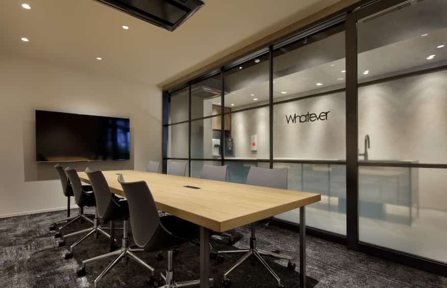 8人がけのBIGテーブルを設置したミーティングルームには壁面にモニターも設置しています。大切なクライアントを招いての会議にもご活用いただけます。